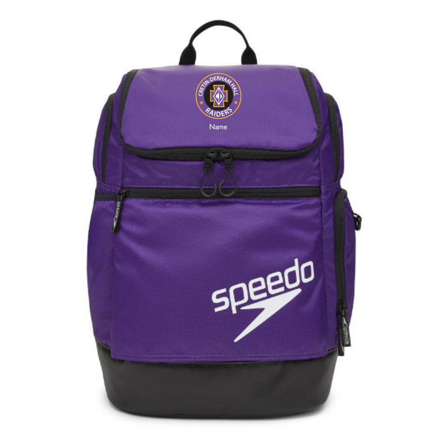 The Speedo Teamster 2.0 backpack is a must-have for serious swimmers. It's been designed and improved by athletes to meet all your gear needs. With a sleeker body, customizable top flap, and hidden ventilated front pocket, this bag stands out from the rest. Stay organized and worry-free with its unlined main compartment, side pocket for damp items, and large water bottle holder.