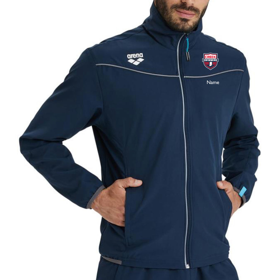 The Arena Team Jacket Panel is the perfect lightweight jacket made for for warm ups. The zipper side pockets ensure you will have what you need with you before your races.